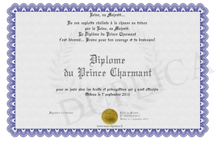 Envoyez par email votre Diplôme du Prince Charmant personalisé