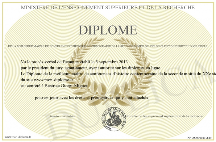 Envoyez par email votre Diplôme de la meilleure maître de conférences d'histoire contemporaine de la seconde moitié du XXe siècle et du début du XXIe siècle personalisé