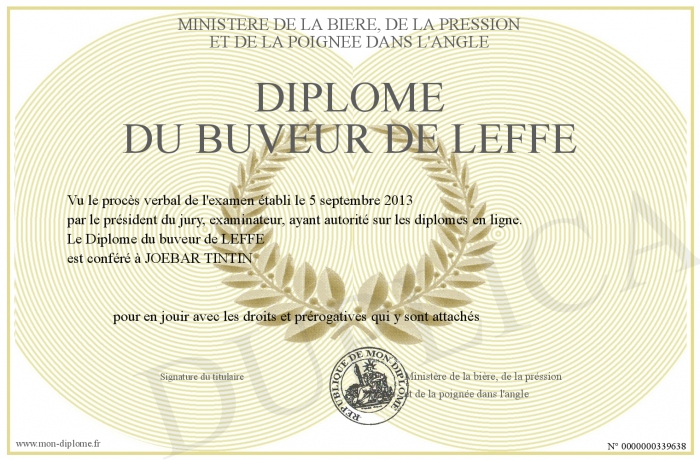 Envoyez par email votre Diplôme du buveur de LEFFE personalisé