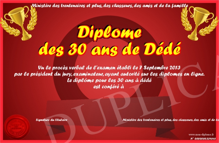 Envoyez par email votre Diplôme des 30 ans de Dédé personalisé