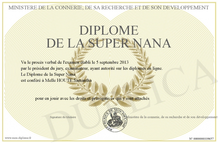 Envoyez par email votre Diplôme de la Super Nana personalisé