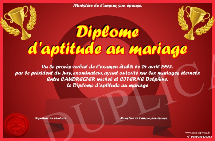 Envoyez par email votre Diplome d'aptitude au mariage personalisé