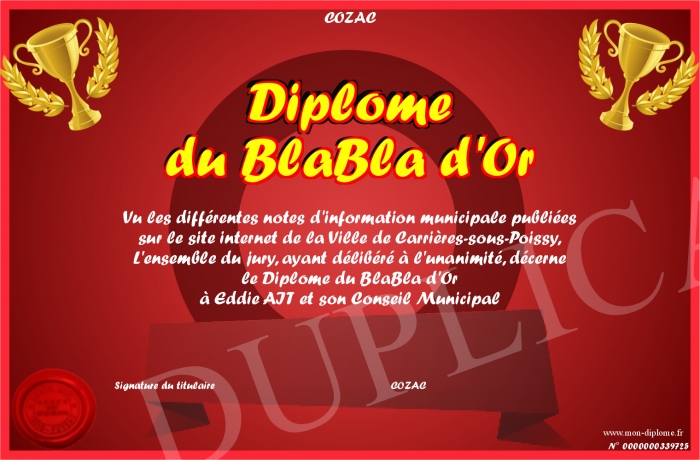 Envoyez par email votre Diplôme du BlaBla d'Or personalisé