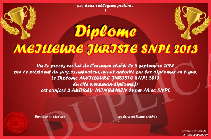 Envoyez par email votre Diplôme MEILLEURE JURISTE SNPL 2013 personalisé