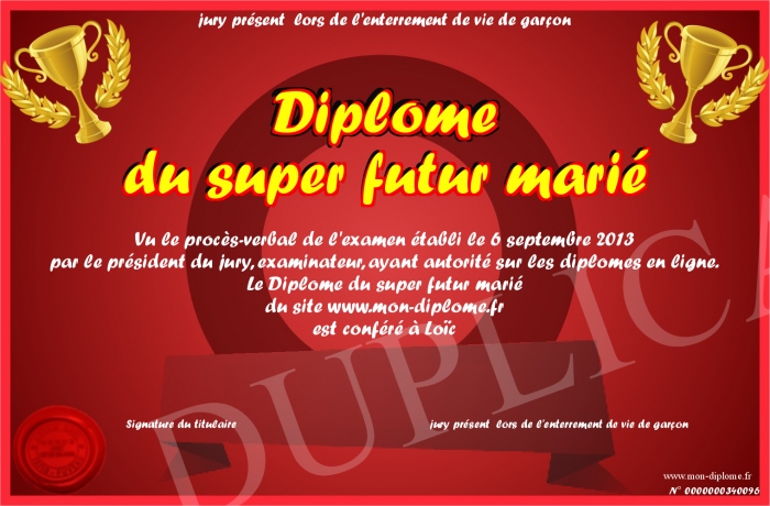 Envoyez par email votre Diplôme du super futur marié personalisé