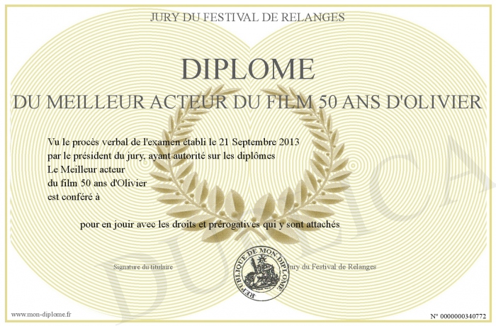 Envoyez par email votre Diplôme du meilleur acteur du film 50 ans d'Olivier personalisé