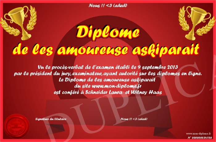 Envoyez par email votre Diplôme de les amoureuse askiparait personalisé