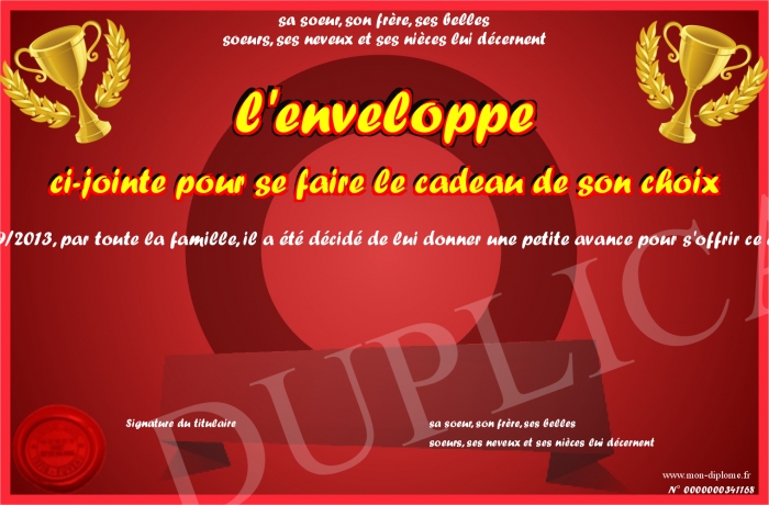 Envoyez par email votre l'enveloppe ci-jointe pour se faire le cadeau de son choix personalisé
