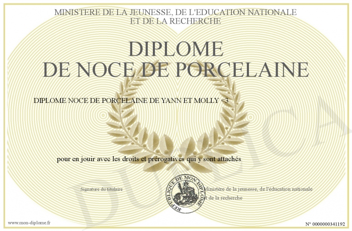Envoyez par email votre Diplôme de noce de porcelaine personalisé