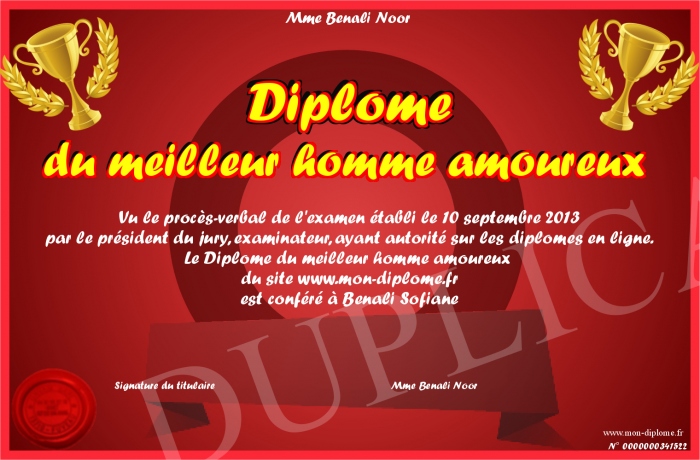 Envoyez par email votre Diplôme du meilleur homme amoureux personalisé