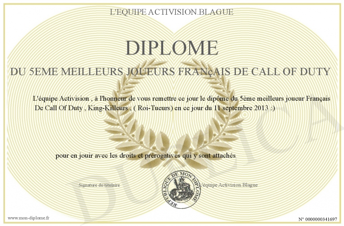 Envoyez par email votre Diplôme Du 5ème meilleurs Joueurs Français De Call Of Duty personalisé