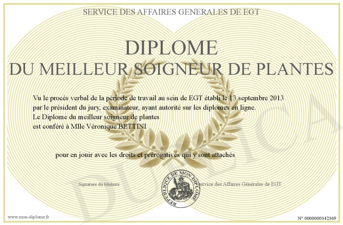 Envoyez par email votre Diplôme du meilleur soigneur de plantes personalisé