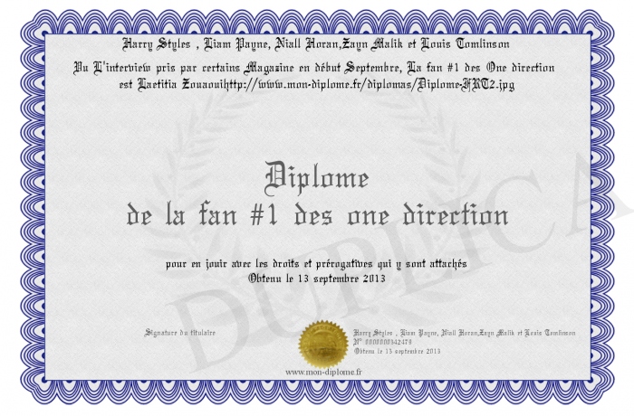 Envoyez par email votre Diplôme de la fan #1 des one direction personalisé