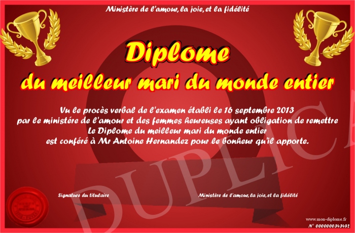 Envoyez par email votre Diplôme du meilleur mari du monde entier personalisé