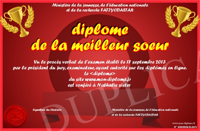 Envoyez par email votre diplôme de la meilleur soeur personalisé