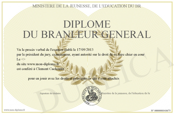 Envoyez par email votre Diplôme du branleur general personalisé