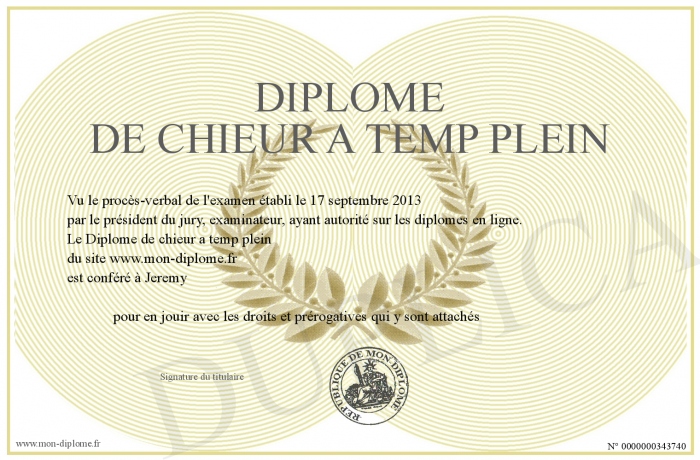 Envoyez par email votre Diplôme de chieur a temp plein personalisé