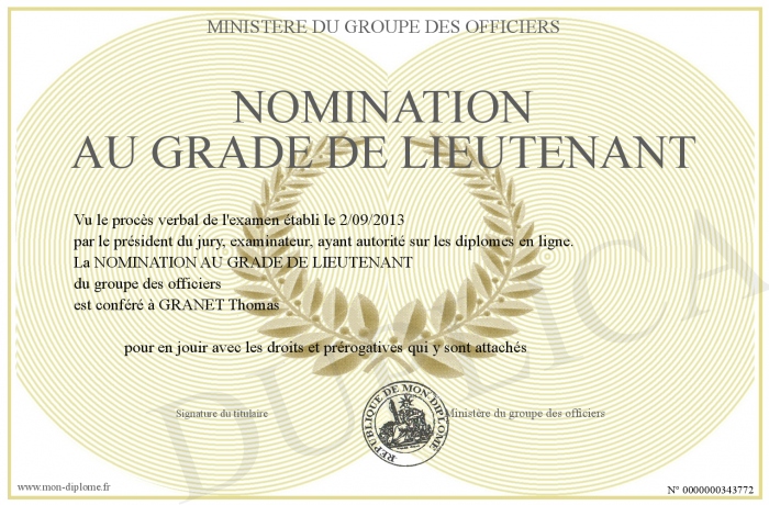 Envoyez par email votre NOMINATION AU GRADE DE LIEUTENANT personalisé