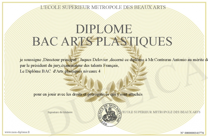 Envoyez par email votre Diplôme BAC Arts plastiques personalisé