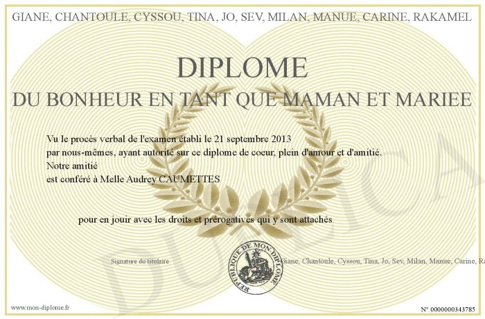 Envoyez par email votre Diplôme du Bonheur en tant que Maman et Mariée personalisé