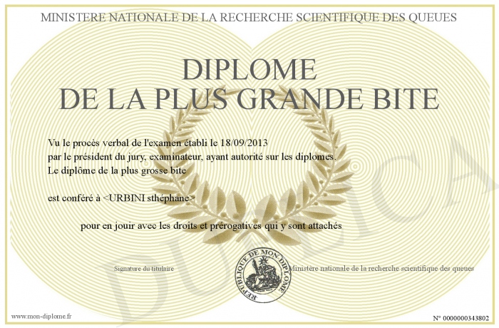 Envoyez par email votre Diplôme de la plus grande bite personalisé