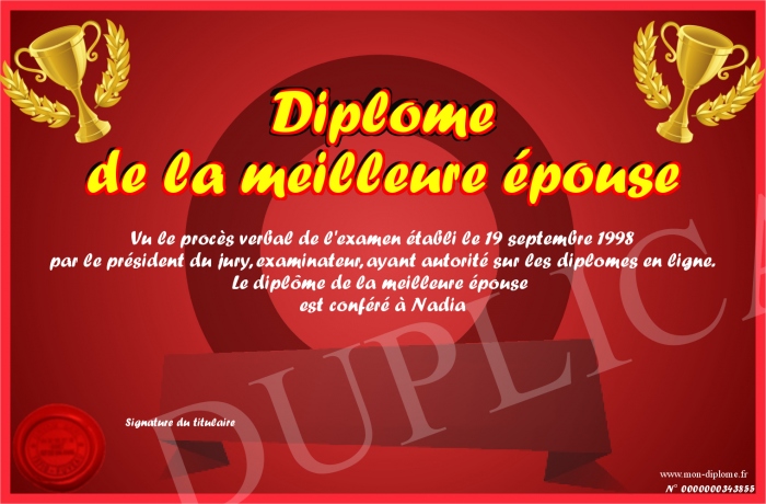 Envoyez par email votre Diplôme de la meilleure épouse personalisé