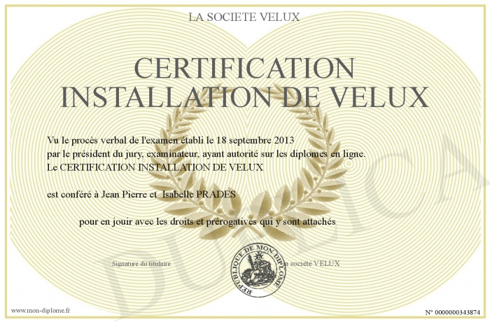 Envoyez par email votre CERTIFICATION INSTALLATION DE VELUX personalisé