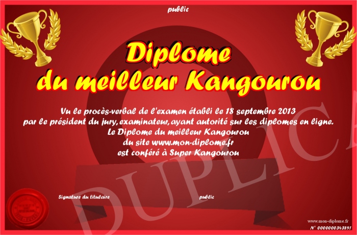 Envoyez par email votre Diplome du meilleur Kangourou personalisé