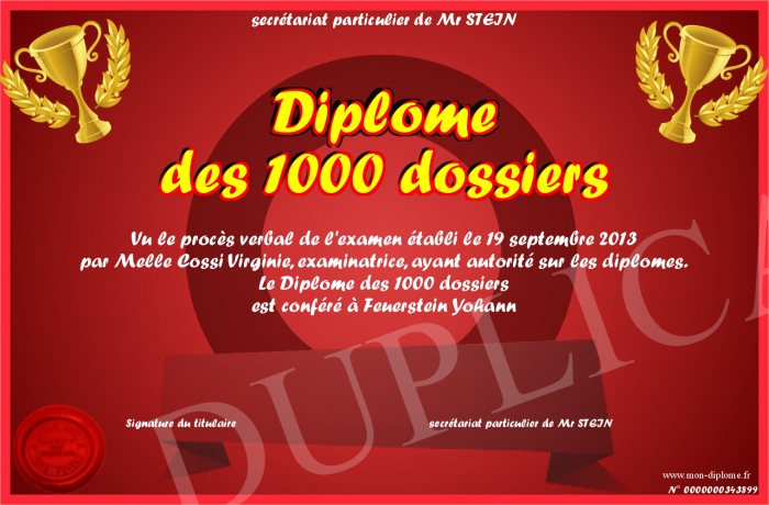 Envoyez par email votre Diplôme des 1000 dossiers personalisé