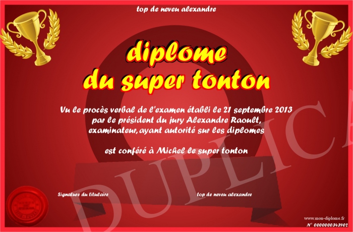 Envoyez par email votre diplome du super tonton personalisé