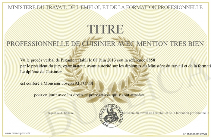 Envoyez par email votre TITRE PROFESSIONNELLE DE CUISINIER AVEC MENTION TRES BIEN personalisé