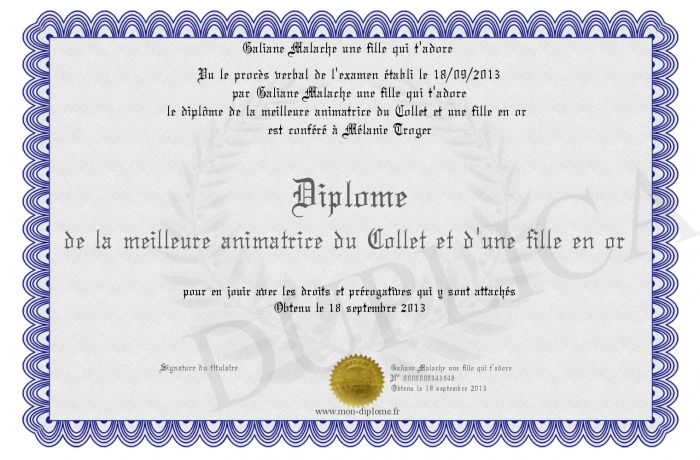 Envoyez par email votre Diplôme de la meilleure animatrice du Collet et d'une fille en or personalisé