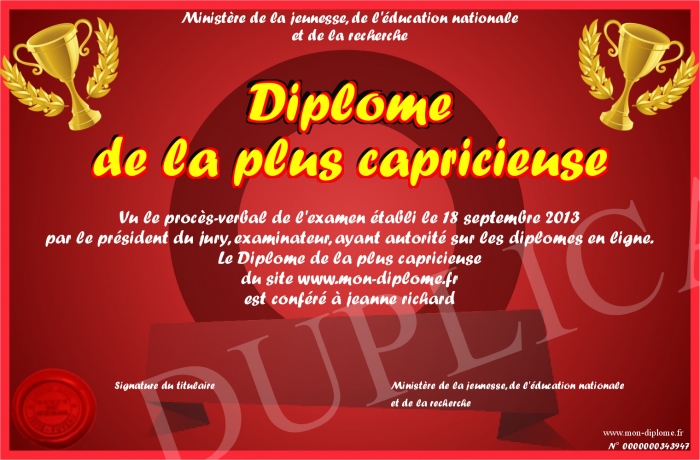 Envoyez par email votre Diplôme de la plus capricieuse personalisé