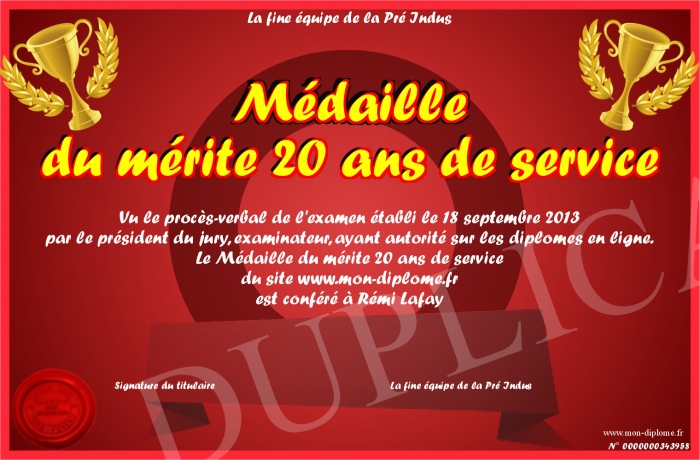 Envoyez par email votre Médaille du mérite 20 ans de service personalisé