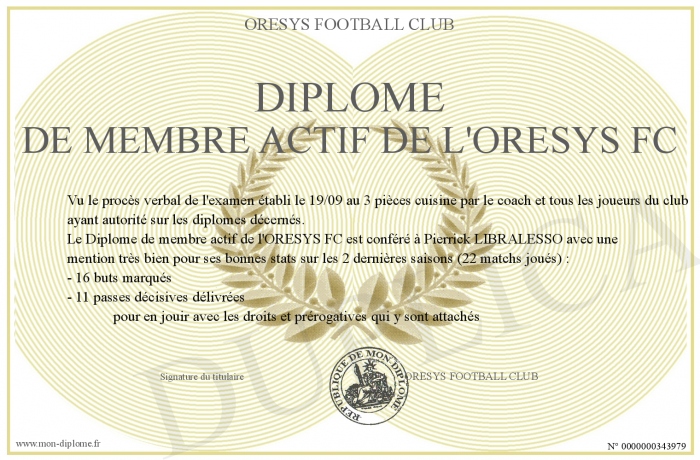 Envoyez par email votre Diplôme de membre actif de l'ORESYS FC personalisé