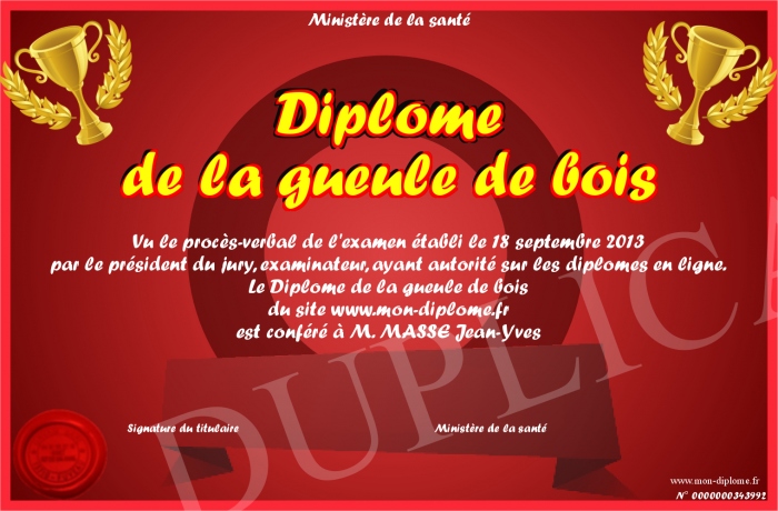 Envoyez par email votre Diplôme de la gueule de bois personalisé