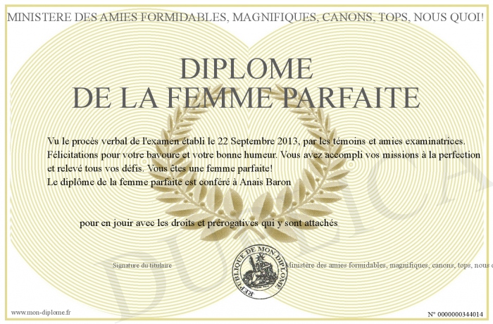 Envoyez par email votre Diplôme de la Femme Parfaite personalisé