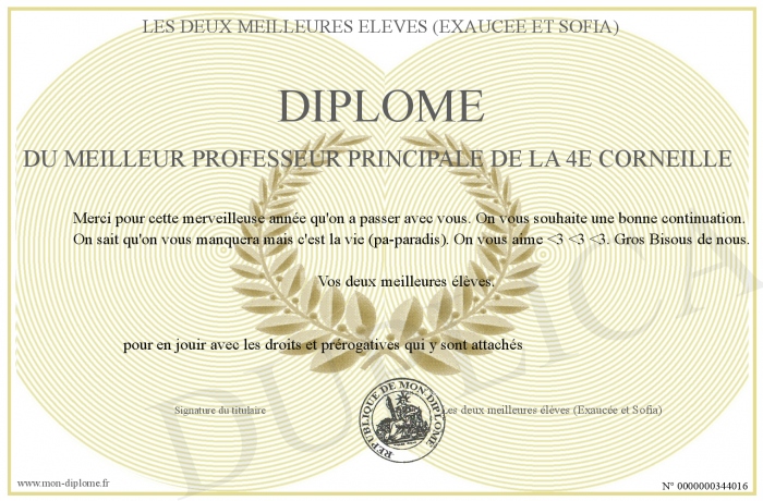 Envoyez par email votre Diplôme du meilleur professeur principale de la 4e Corneille personalisé