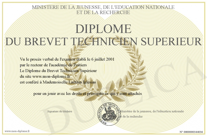 Envoyez par email votre Diplôme du Brevet Technicien Supérieur personalisé