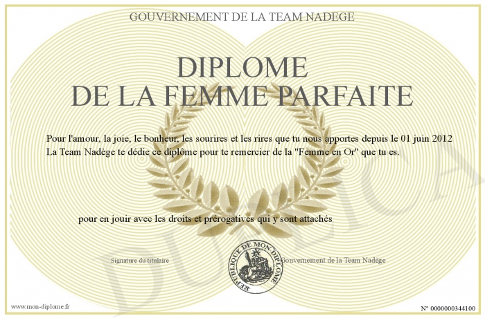 Envoyez par email votre Diplôme de la Femme Parfaite personalisé