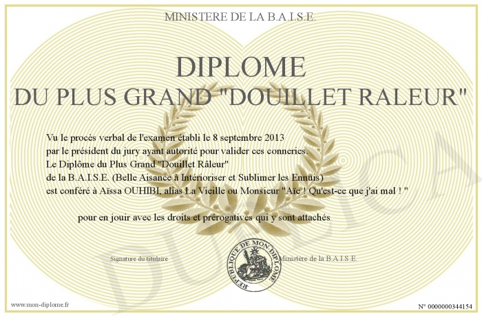 Envoyez par email votre Diplôme du Plus Grand -Douillet Raleur- personalisé