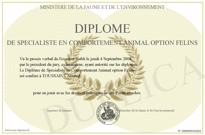 Envoyez par email votre Diplôme de Spécialiste en Comportement Animal option Félins personalisé