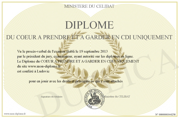 Envoyez par email votre Diplôme du COEUR A PRENDRE ET A GARDER EN CDI UNIQUEMENT personalisé