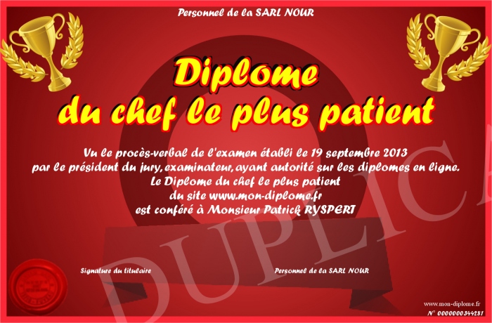 Envoyez par email votre Diplôme du chef le plus patient personalisé