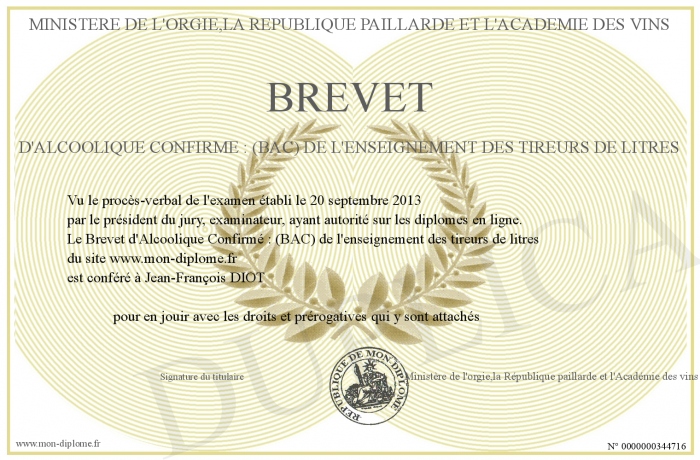 Envoyez par email votre Brevet d'Alcoolique Confirmé : (BAC) de l'enseignement des tireurs de litres personalisé