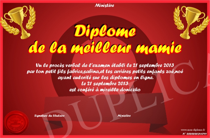 Envoyez par email votre Diplôme de la meilleur mamie personalisé