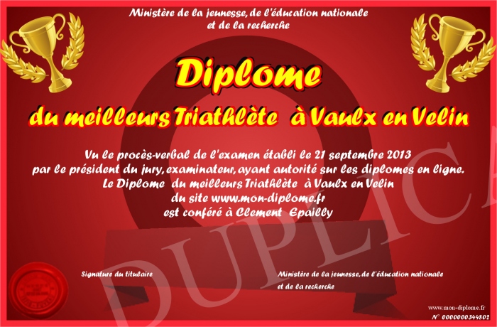 Envoyez par email votre Diplôme du meilleurs Triathlète à Vaulx en Velin personalisé
