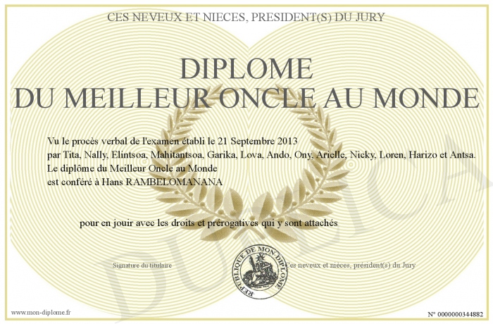 Envoyez par email votre Diplôme du meilleur oncle au monde personalisé