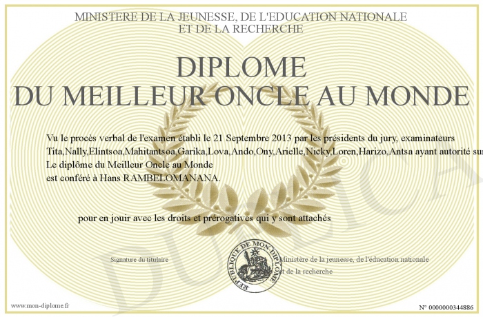 Envoyez par email votre Diplôme du meilleur oncle au monde personalisé
