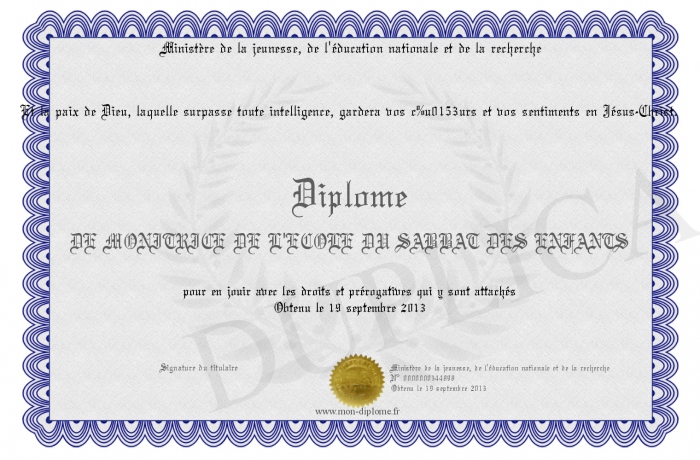 Envoyez par email votre Diplôme DE MONITRICE DE L'ECOLE DU SABBAT DES ENFANTS personalisé